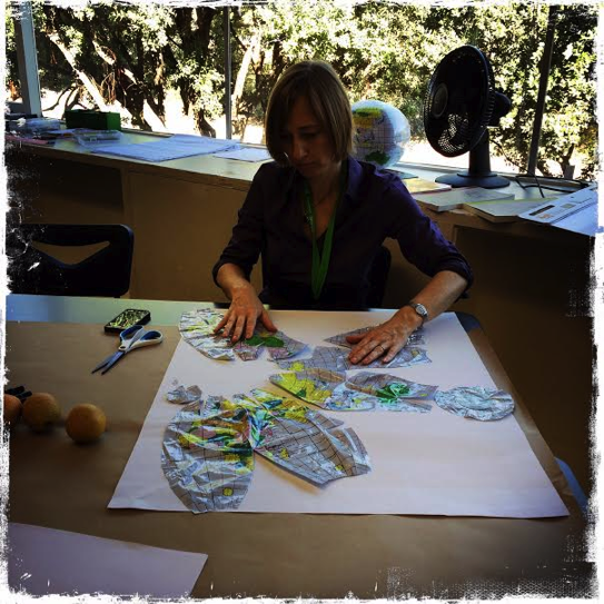 I loved the highly experiential nature of Mariah and Tamar’s workshop. Trying to represent the whole world on a single piece of paper naturally led to fundamental questions about issues of perspective and who holds power in the world. It was fascinating to debrief with other participants about their experiences of trying to flatten the globe, including how their own biographies and interests helped shape their process. (I have a special affinity for Australia because I used to live there, for example, and I cut around its edges with special care). One participant questioned the way in which maps tend to draw more attention to land than ocean. Another asserted that representations of the world should convey the urgency of safeguarding the environment and earth’s fragility.