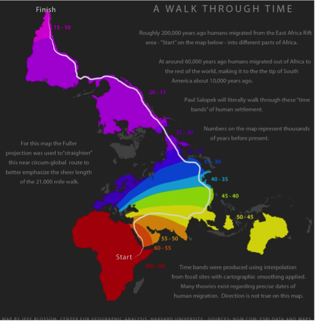 Jeff Blossom of Harvard University’s Center for Geographic Analysis has created some beautiful maps that tell the overarching story of our ancient human ancestors’ migration and how that story relates to Paul’s epic walk: we posted these a while back in our Educator Resources and Forum. The first map “straightens” out Paul’s walk to convey its length, while indicating different phases of human settlement. The second map indicates the broad trajectory of humans’ journey out of Africa, and displays differences in seabed exposures, which made aspects of our great human migration possible at that time. (Click on the images to see them in better detail.)