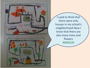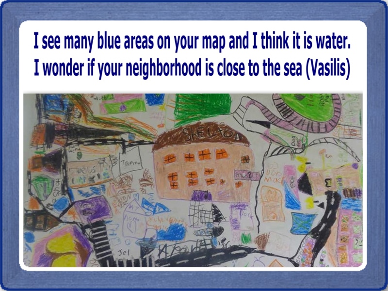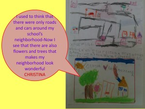 This new perspective of looking at common things through different and more “patient” lenses encouraged children to become critical of their own situated assumptions about their immediate environment. Upon returning to the classroom after this thoughtful walk, children used different media to share their initial ideas about the neighborhood as well as their shift in thinking (see below).