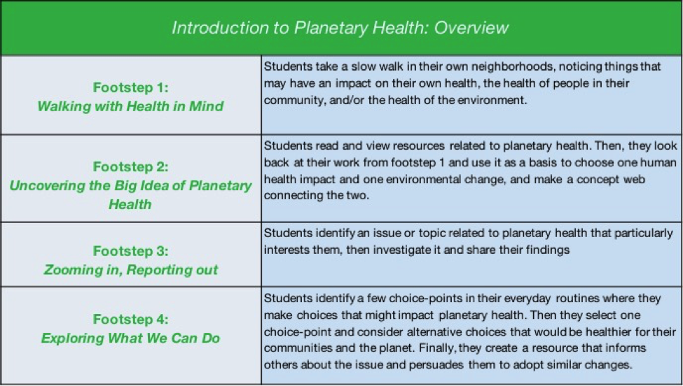 In keeping with other OOEL special learning journeys, the Introduction to Planetary Health consists of four activities, or ‘footsteps.’ It’s quite a challenge to develop a short learning journey on such a vast topic, and we began the work with many spirited discussions about how to focus the curriculum. Eventually, we settled on four learning goals. We decided that the curriculum should encourage students to: