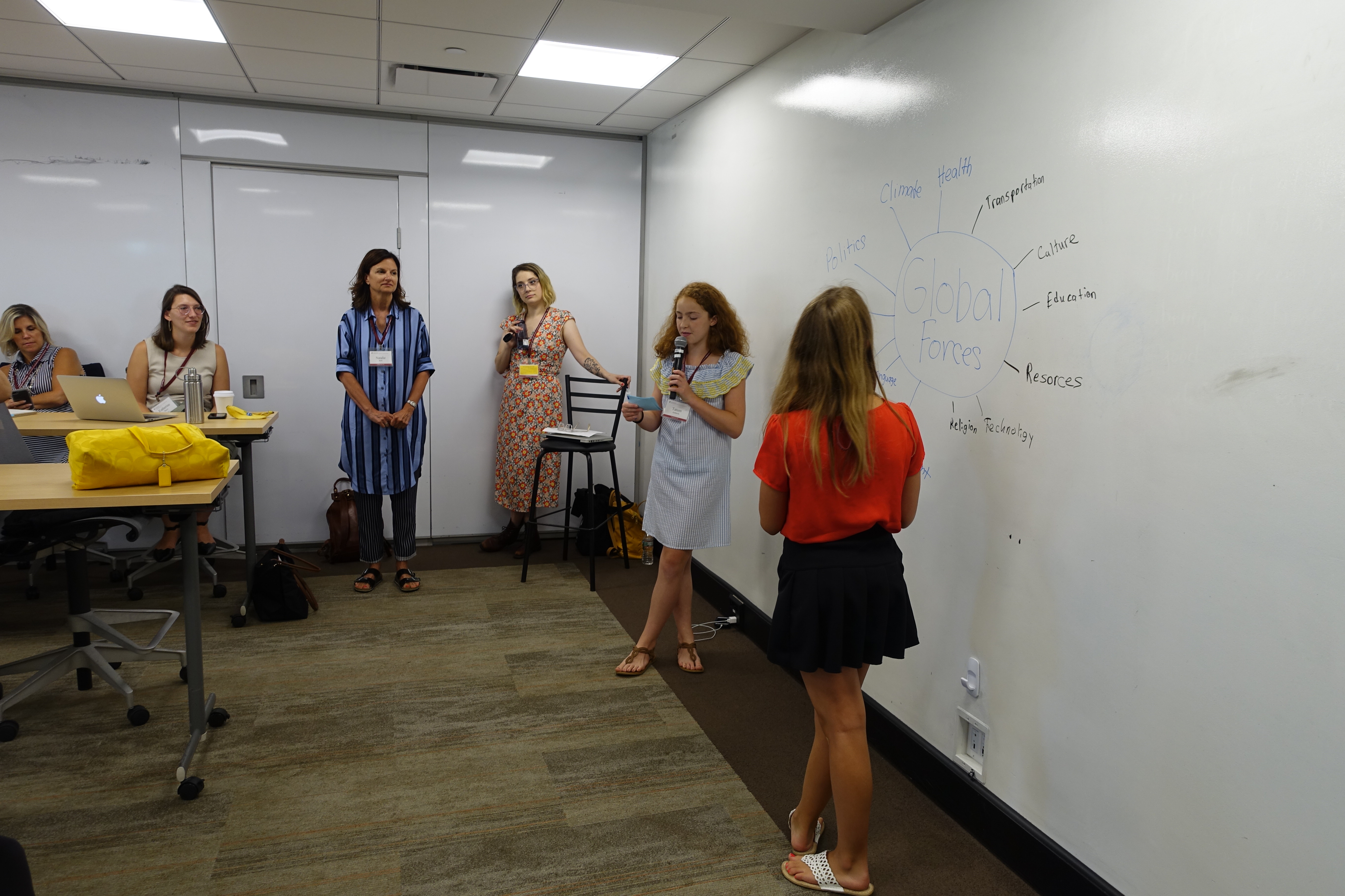 Facilitation team in front of the Project Zero project wall (left to right): Susie Blair, Sarah Sheya, Finn Bergquist, Tatum Amberik, Natalie Belli.