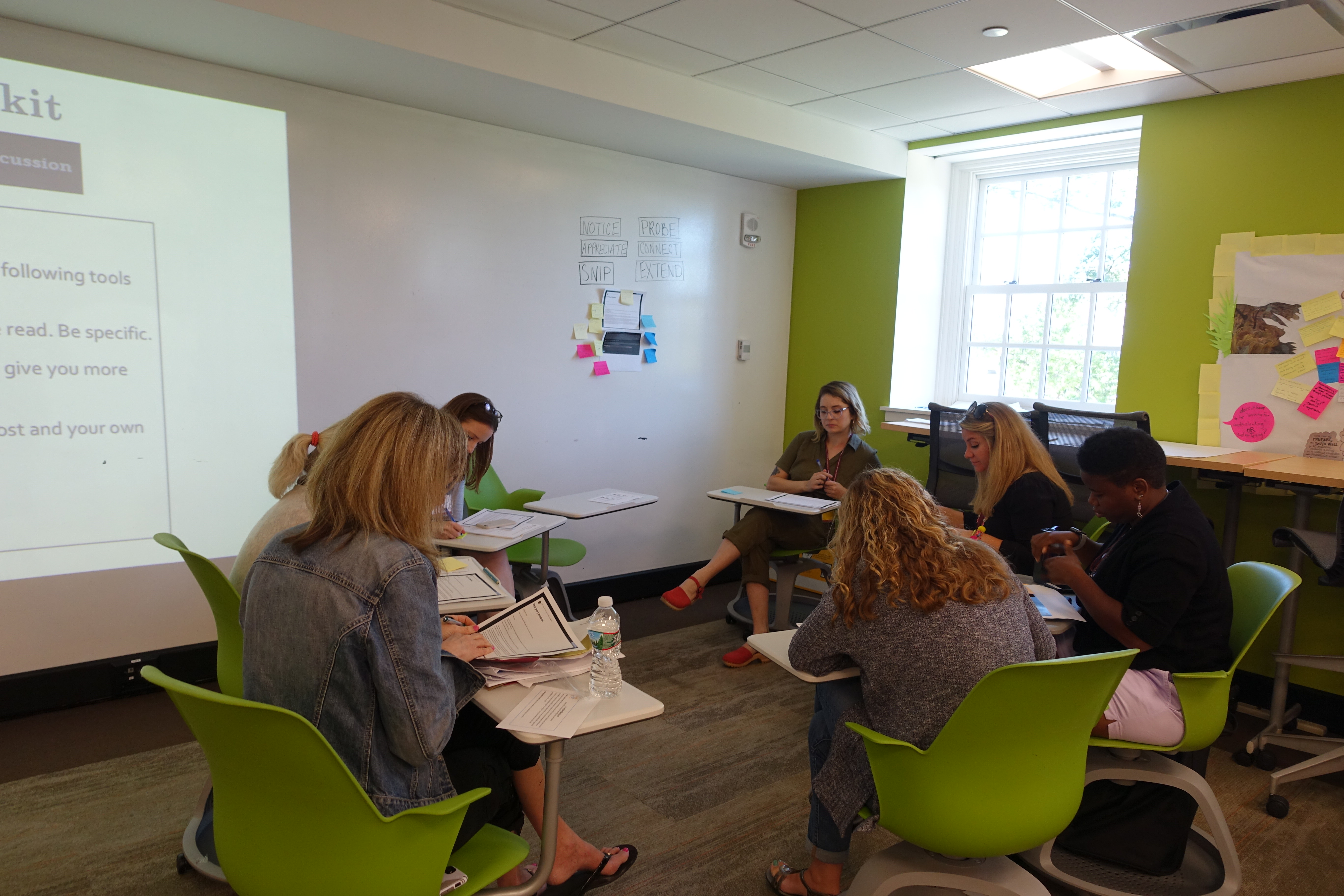 Facilitation team in front of the Project Zero project wall (left to right): Susie Blair, Sarah Sheya, Finn Bergquist, Tatum Amberik, Natalie Belli.
