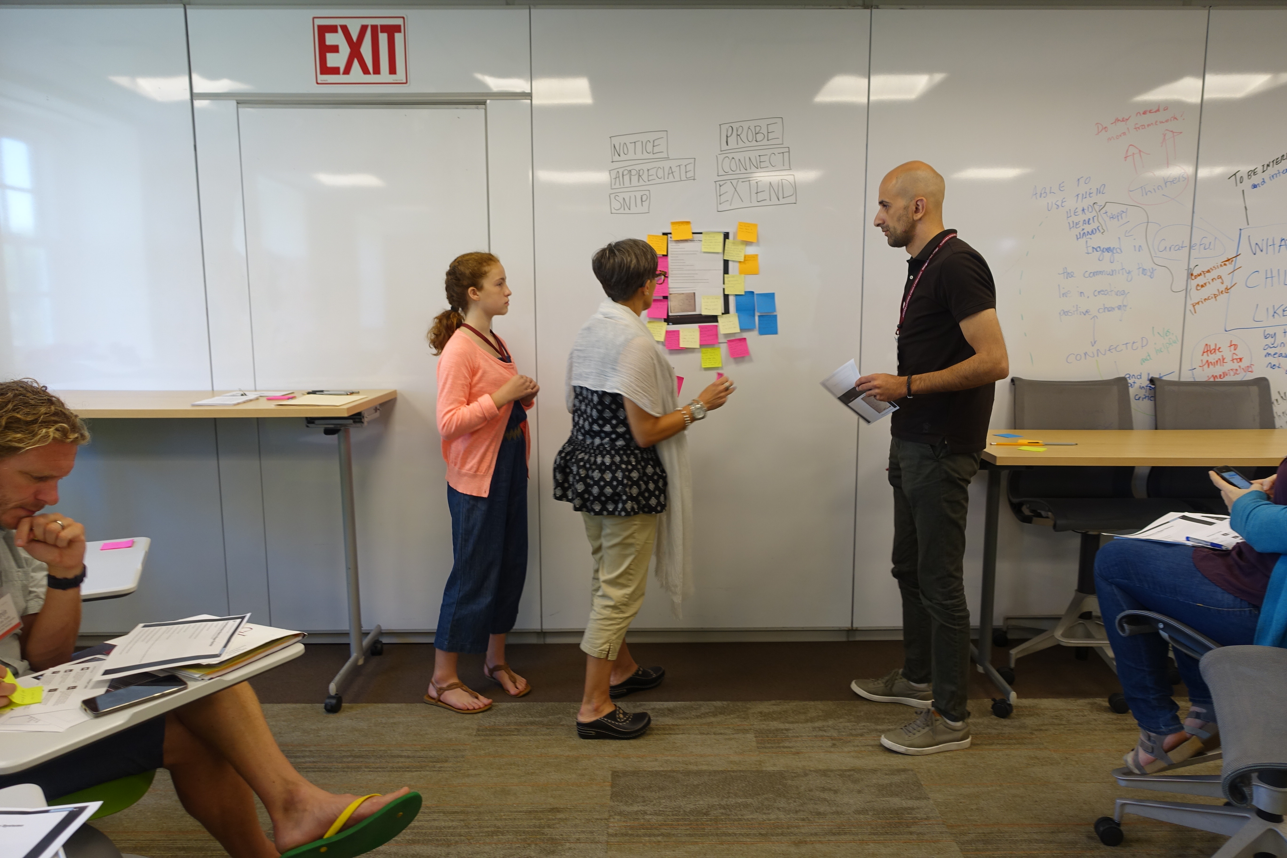 Facilitation team in front of the Project Zero project wall (left to right): Susie Blair, Sarah Sheya, Finn Bergquist, Tatum Amberik, Natalie Belli.