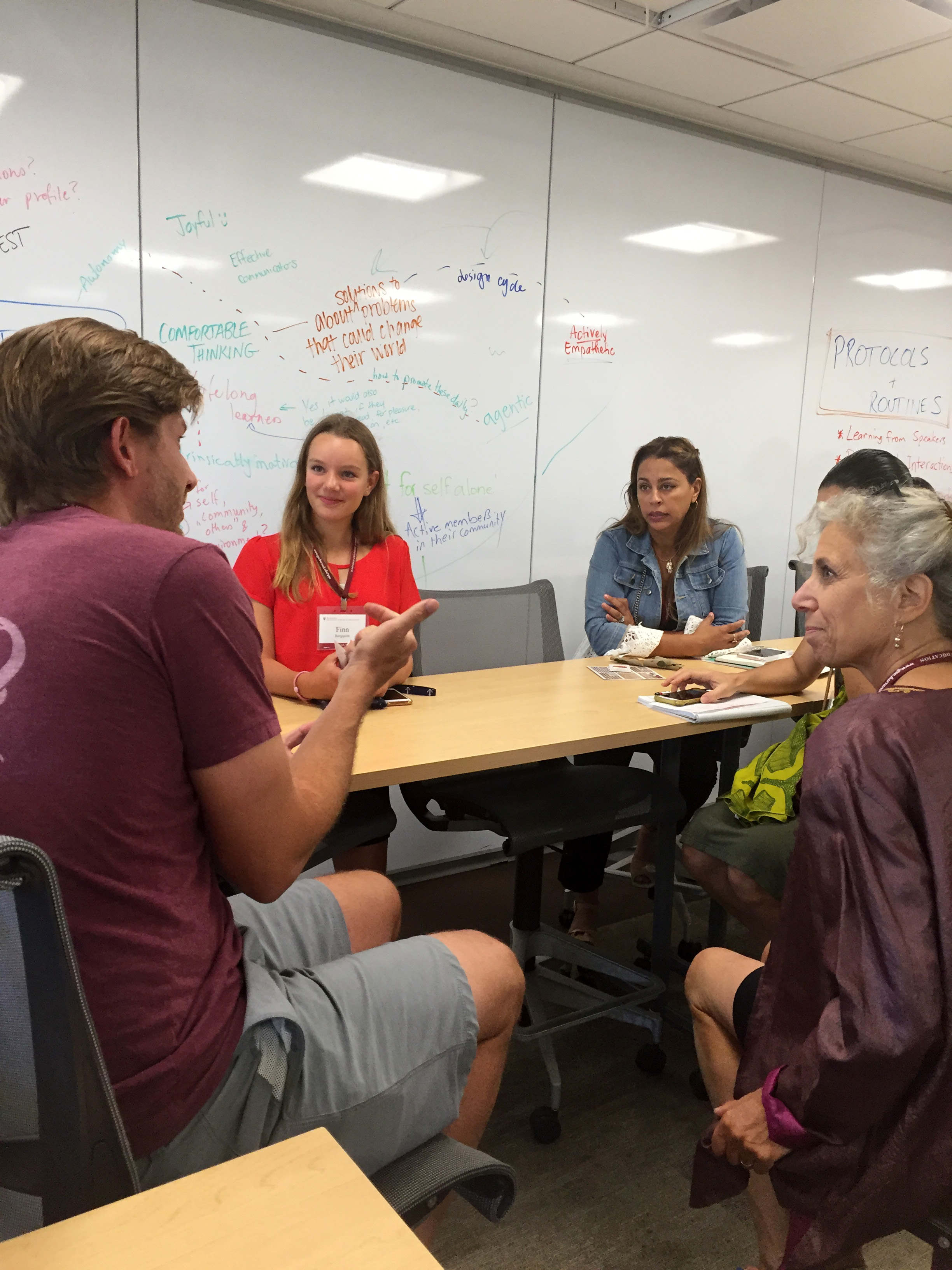 Facilitation team in front of the Project Zero project wall (left to right): Susie Blair, Sarah Sheya, Finn Bergquist, Tatum Amberik, Natalie Belli.
