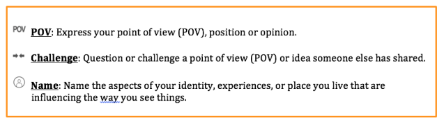 Taking a cue from Athens_0’s comment, our latest iteration of the updated Dialogue Toolkit includes a similarly structured commenting prompt to support student use of the Name tool: “I am thinking of [the topic] from the point of view of someone who… [name the particular identity/experience that is influencing your perspective on the topic].”