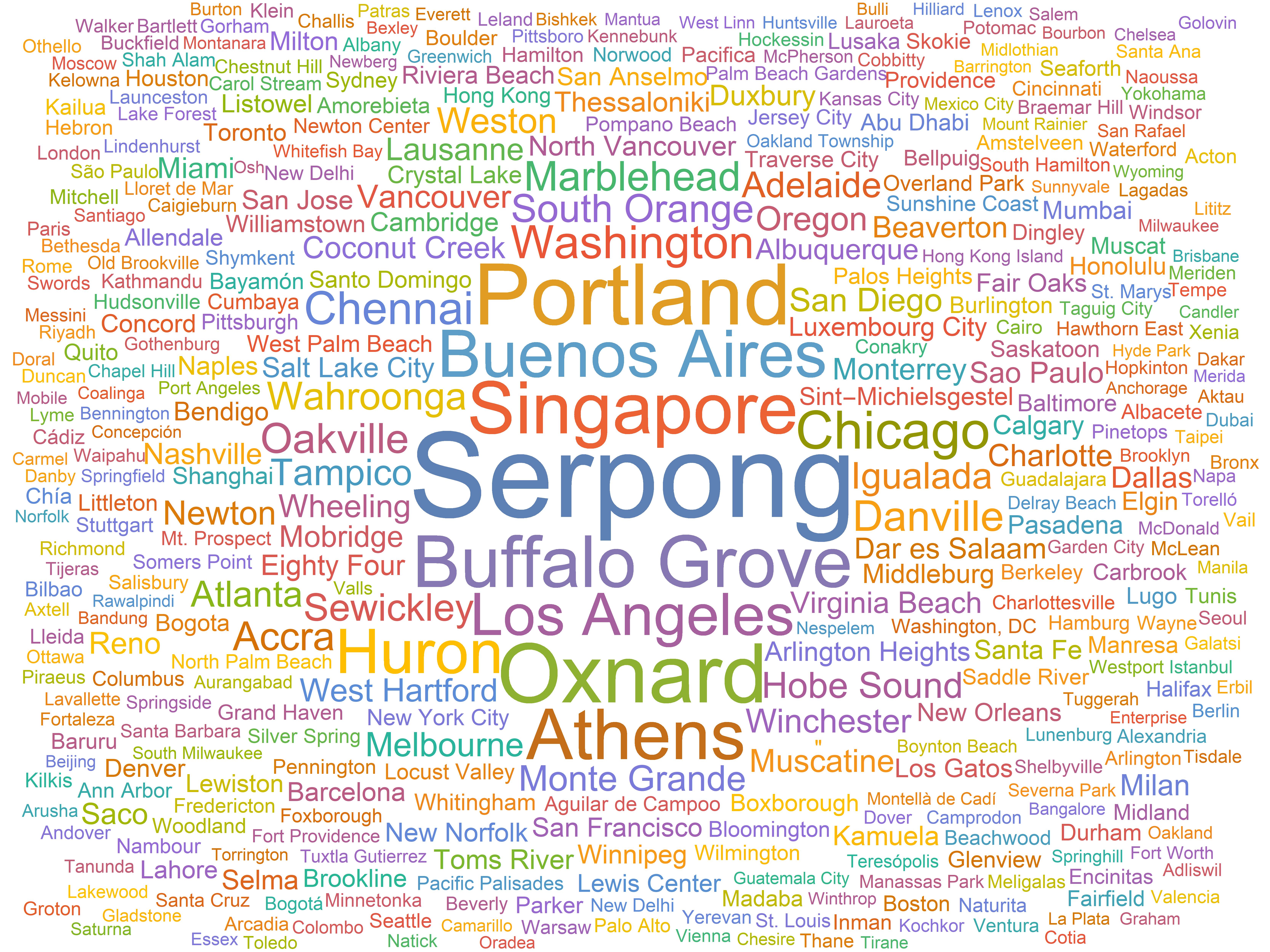 Figure 3. The 399 cities represented in the Out of Eden Learn platform, where the size of each city is scaled by the number of students participating in that city.