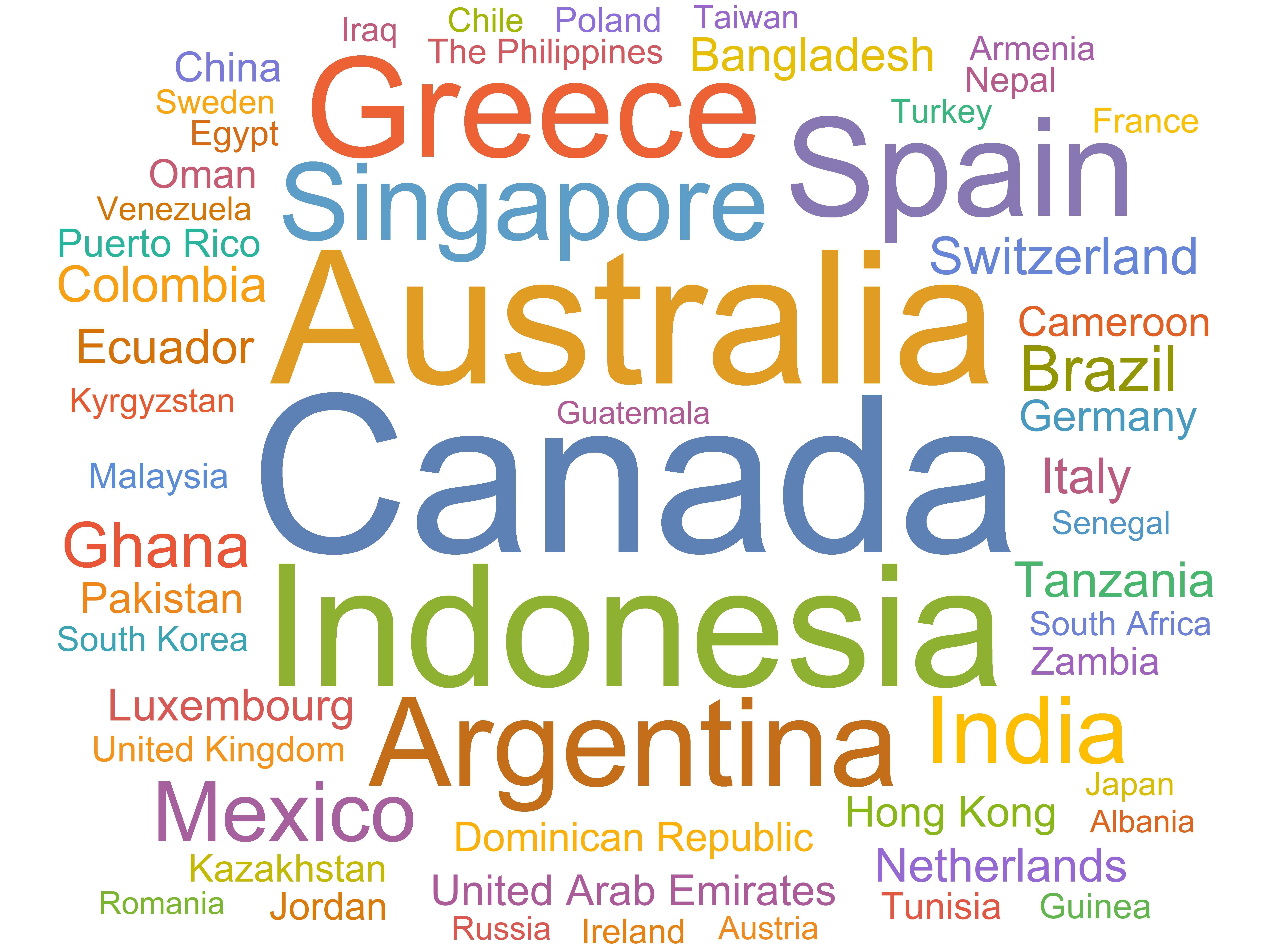 Figure 1. Countries represented in the Out of Eden Learn platform, where the size of each country is scaled by the number of students participating in that country.