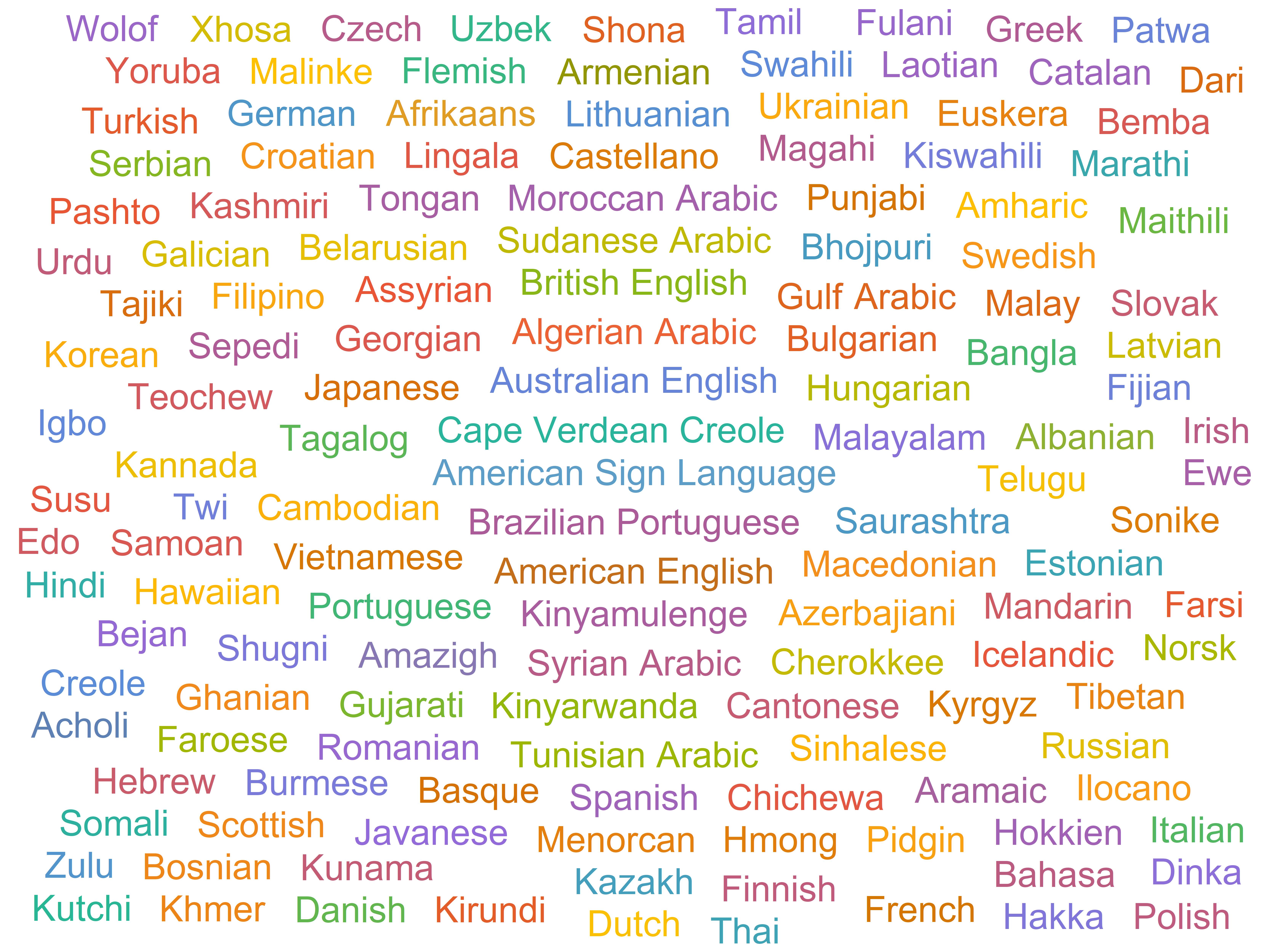 Figure 4. Languages that students on the Out of Eden Learn platform report they speak at home. The languages here are not scaled, meaning the number of students that report the same language does not affect the size of the text.