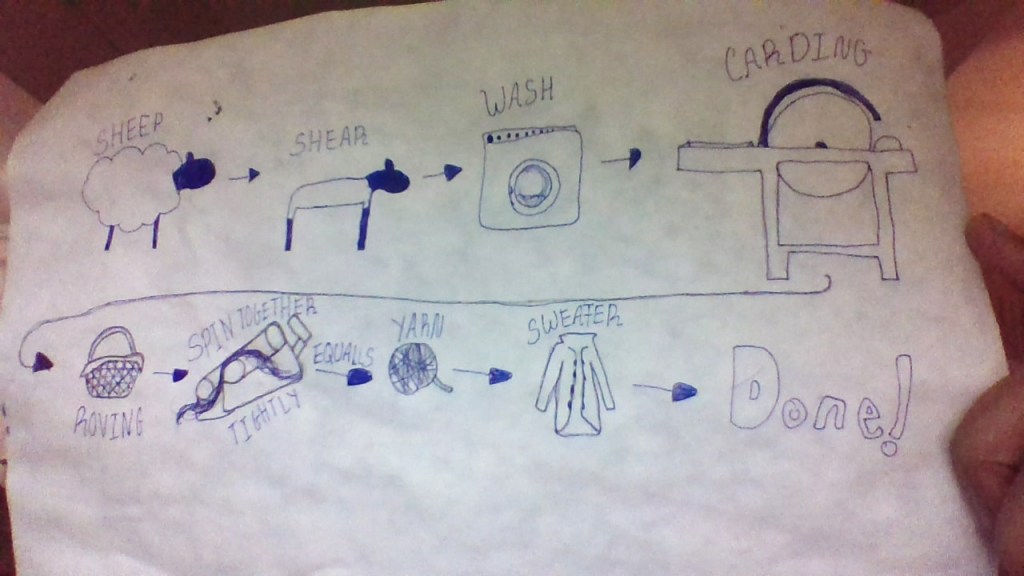 Processes: More commonly, students focused on a process in their diagram. This was most often the process of manufacturing the selected object. Some of these diagrams illustrated the process without explicitly incorporating people who might be involved in particular elements. Such diagrams visualized, for example, various parts in the process of transforming raw materials into a finished product, such as this diagram showing steps in the process of transforming sheep’s wool into a sweater: