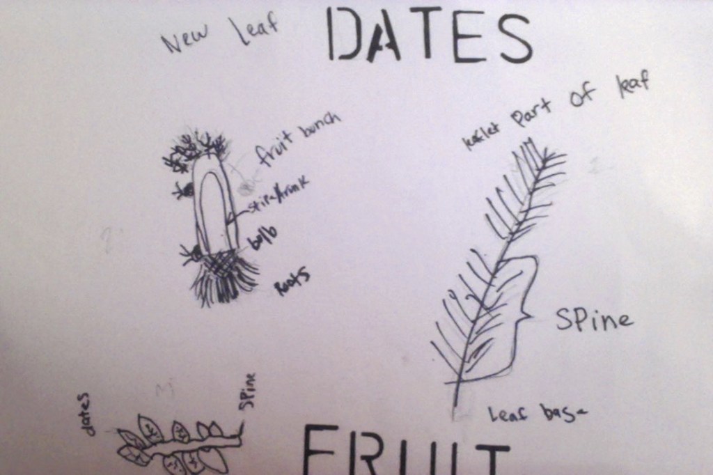 Parts: Although this was not an especially common area of focus, a few students illustrated the object itself as a system, identifying different parts of the object as the elements of the system. Students focused on the parts of both natural objects, like this date plant: