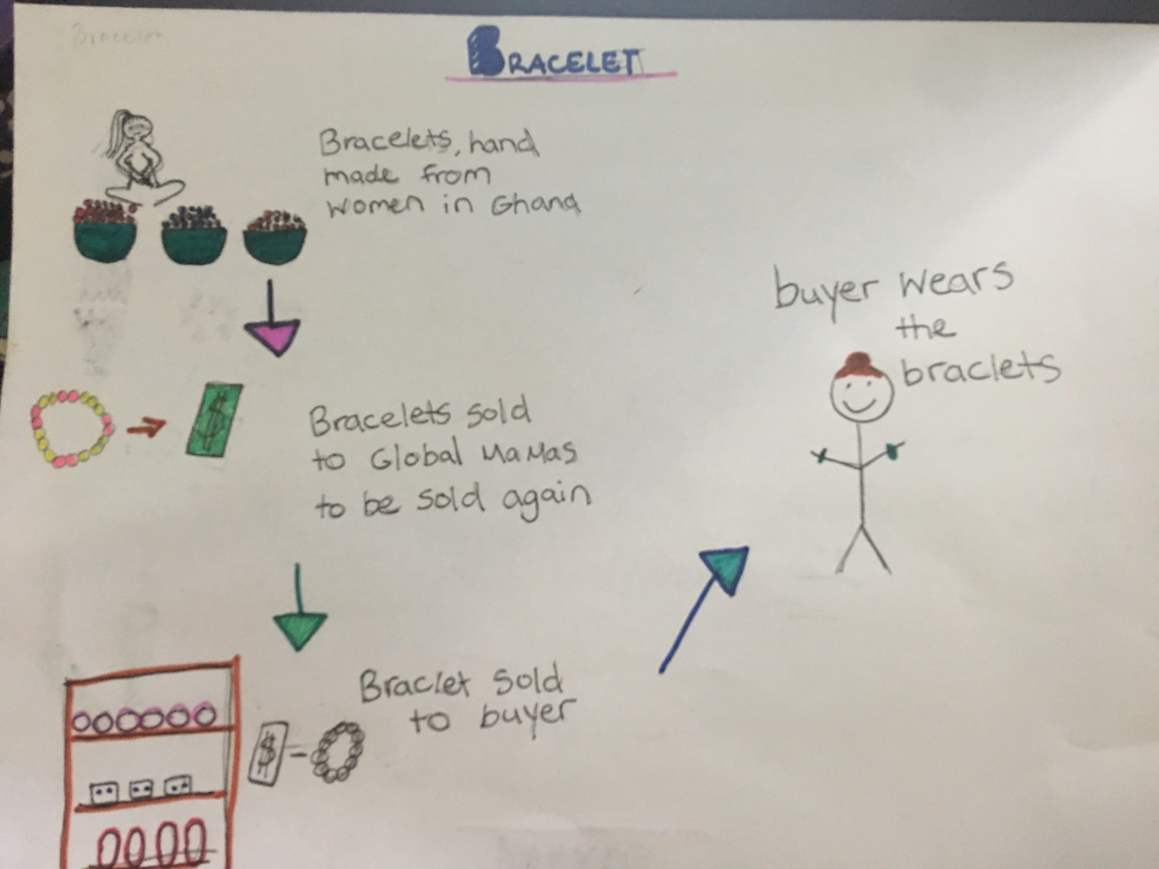 Other students identified people involved in the creation, as well as the consumption, of an object, like the bracelet maker and buyer illustrated below: