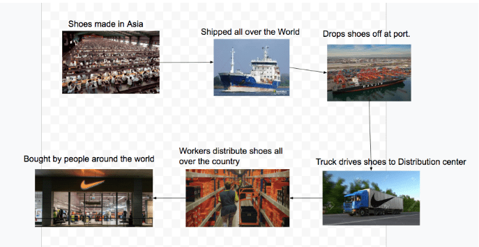 As I discussed in the previous post, many students depicted a process, such as manufacturing or distribution, as their system. Their diagrams often depicted unidirectional, linear relationships between steps in the process, such as the following: